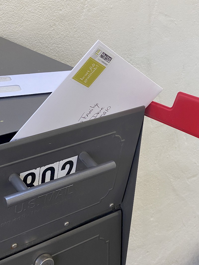 And whatever you do, SEND IT WITH LOVE… seriously, make mailing your card a ritual. I know when the USPS picks up at the local mailbox down the corner. It gets me outside, which is much needed! I take a walk, note card in hand, and even got to meet our local mail carrier Sandra, who delivers these letters with the care and attention they deserve.